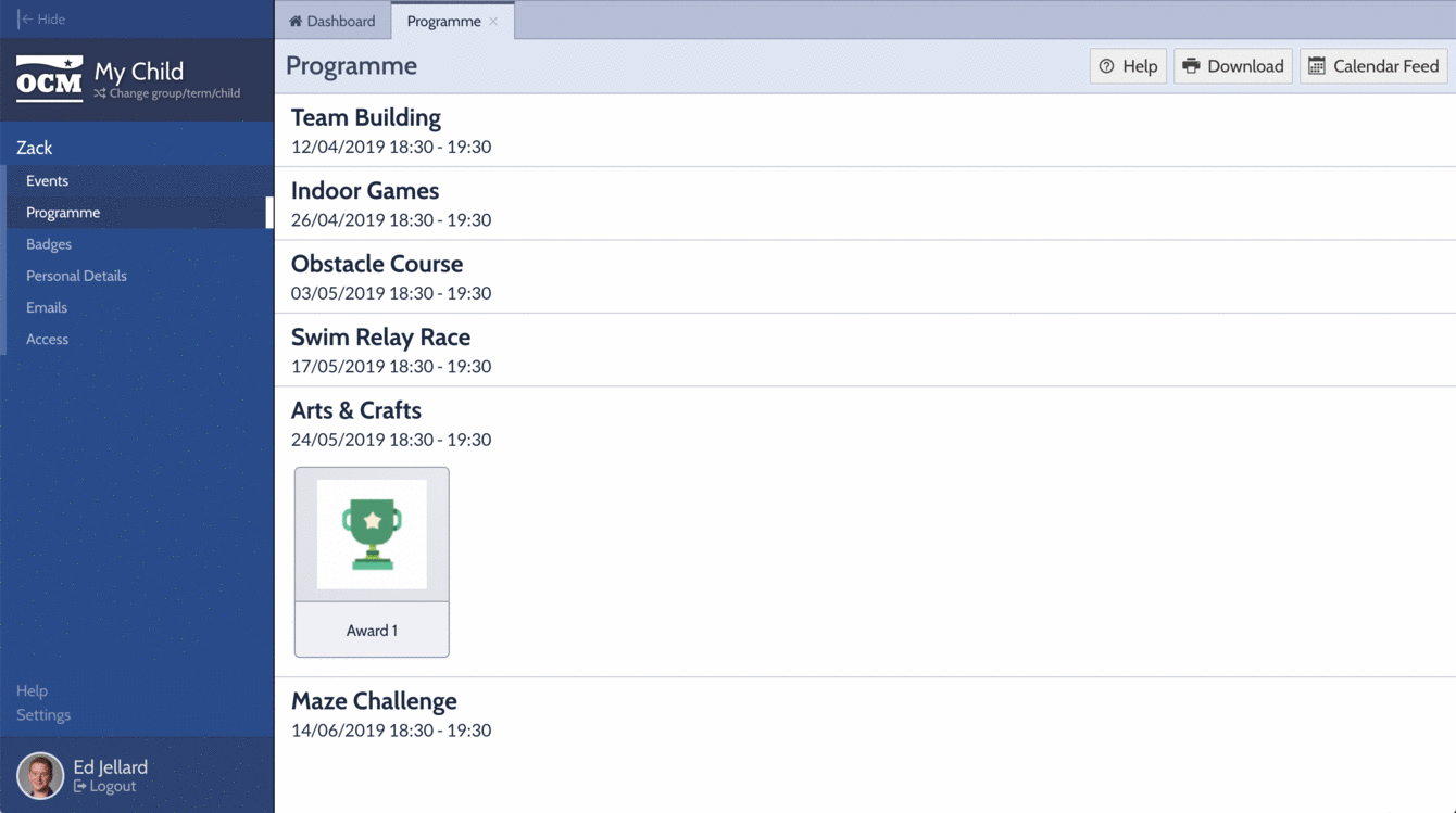 Badges and awards can be automatically updated based on your programme and attendance register.