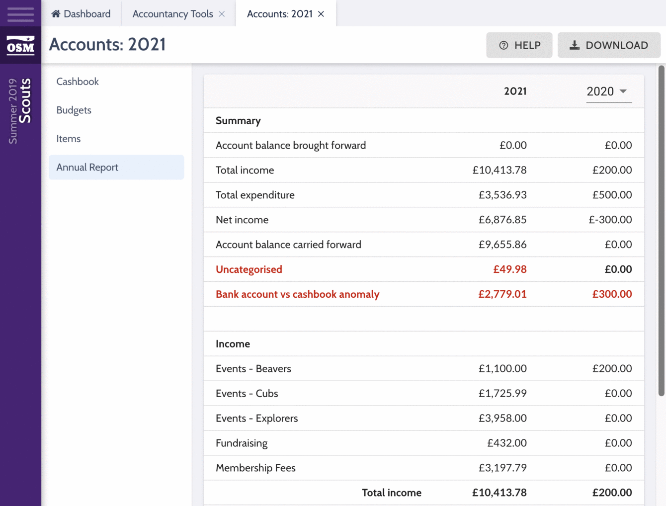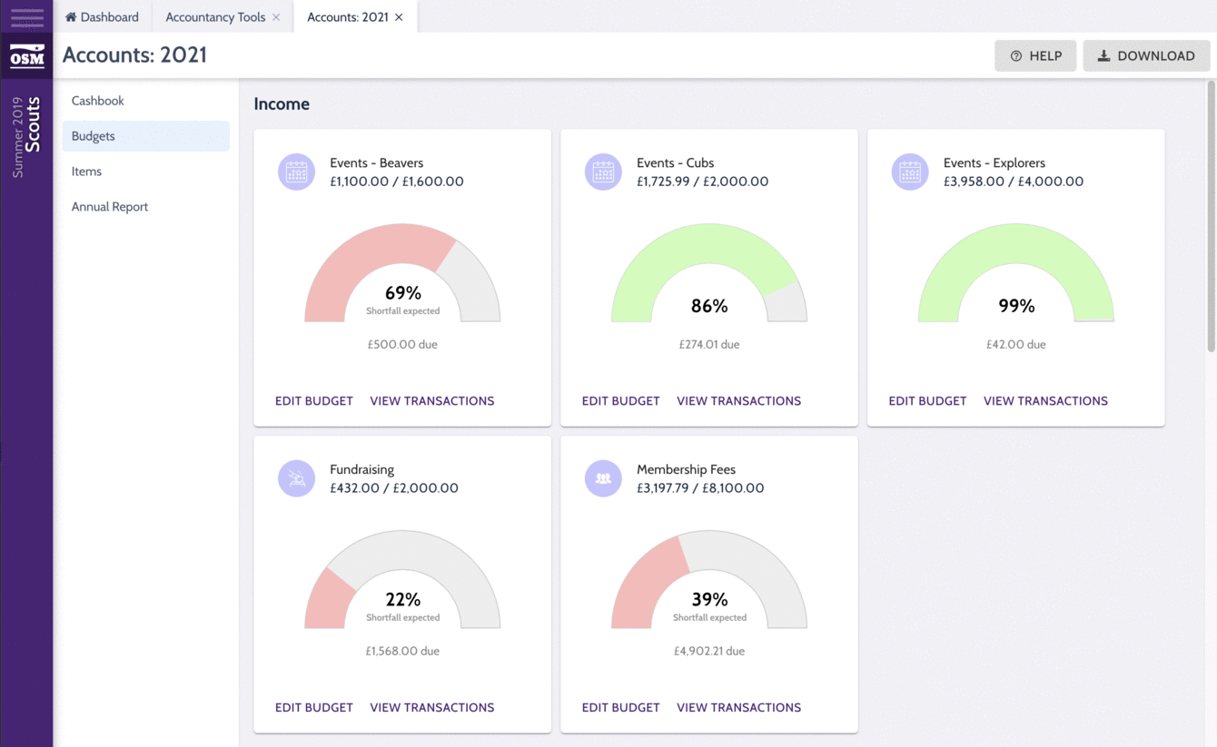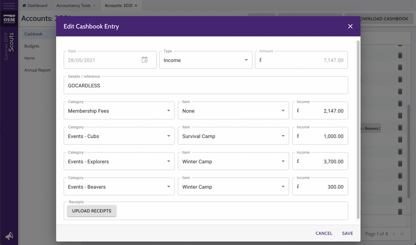- Items can be linked with events in OSM, which allows leaders to check their finances are accurate